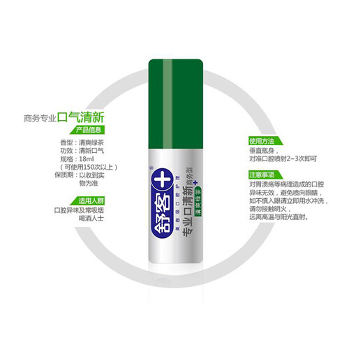 近90度扇面柔感细雾,全面净化口腔,迅速清新口气;清爽绿茶口味,含绿茶植萃精华,清甜甘爽;口红般大小,随时随地畅享清新。