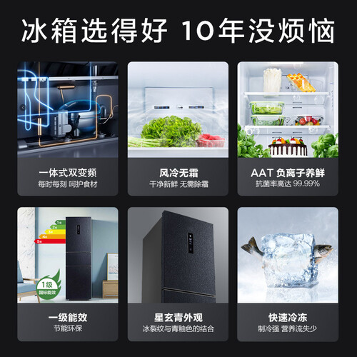 采用ATT负离子养鲜技术,时刻释放负离子保持食材新鲜。搭载一体式双变频系统,控温更精准,轻松实现食物的锁水保鲜。
