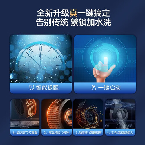 搭载一键高温热熔自清洗功能,能够有效清洁烟机内部的污垢、油渍。内置全封闭的优质电机,轻松减少噪音,使用安静无忧。