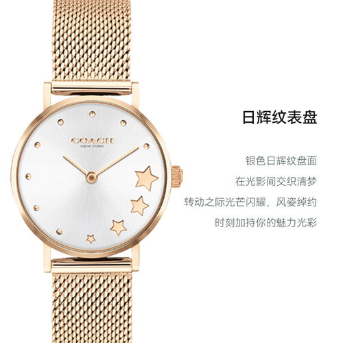 抛弃传统分钟刻度设计,特别采用闪烁星型点缀,个性之余又不乏俏皮可爱。整体采用耀眼金色作为腕表主色,典雅又时髦。