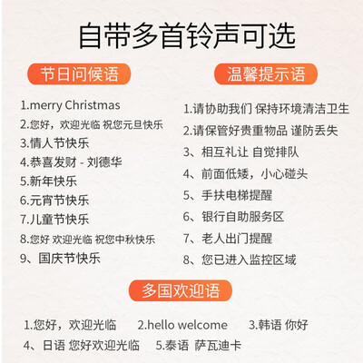 拥有35首门铃乐曲可选,来客自动迎宾提示,更适用于商铺。此外具备夜灯模式,让您在夜间也能自如行动。