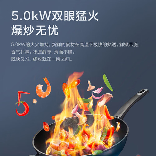 60°黄金拢烟设计,可有效防止油烟向上升腾,烹饪油烟不扑脸。搭配5.0KW双眼猛火,爆炒食物能牢牢锁住营养和新鲜口感。