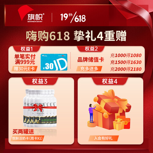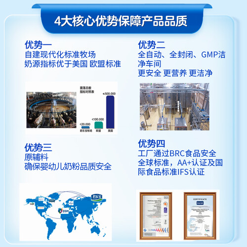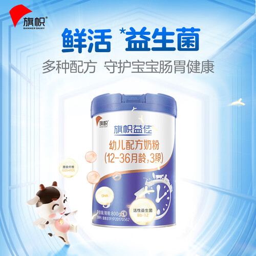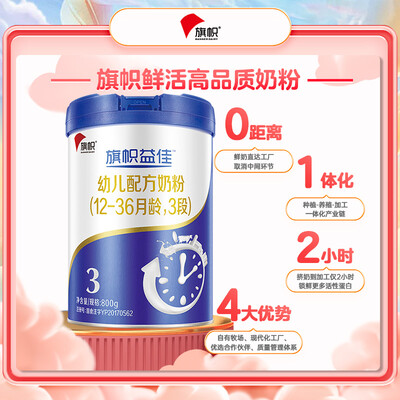 奶粉含有优量水平DHA,能促进宝宝脑部发育;搭配“鲜活”专利技术,以低温封闭管道运输原奶,只为给宝宝提供安全新鲜的营养。