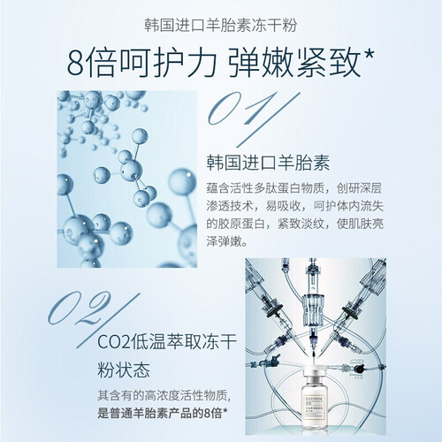 汲取羊胎素精华,补充大量水分,解决干燥缺水肌肤,令面部恢复光滑细嫩。添加富勒烯成分,修护受损组织,提升面部抵御力。
