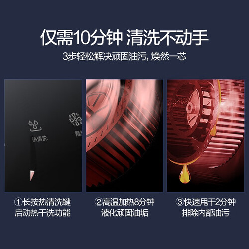 采用侧吸式设计,近距离秒吸油烟,开心下厨身上无异味。搭载一键自热干洗技术,深层洁净油污,机子更加经久耐用。