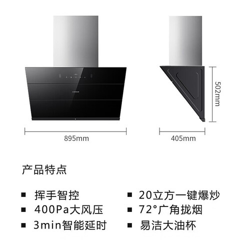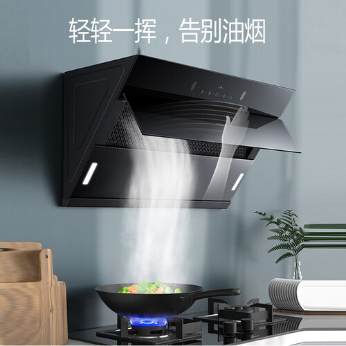无需触控,轻轻一挥即可完成指令,零触屏不油腻。72°广角拢烟,配合895mm自开合拢烟板,排烟效果出色。
