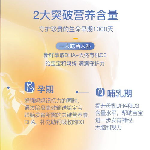 不含重金属,且不添加糖、香精等成分,安全温和,吃的放心。高含量DHA和维生素D3成分,一天一粒便可补充日常所需。