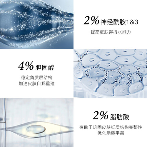 含有神经酰胺、脂肪酸与胆固醇成分,帮助细腻肌肤的毛孔,紧致肌肤。激发肌肤的屏障力,锁住肌肤水分。