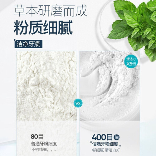 微粒粉末,细腻柔软不伤牙;含有草本护齿成分,去渍不伤牙釉质;360度覆盖,清洁触达牙缝,去黄又护齿。