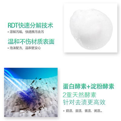 无磷甲醛温和不伤材质,采用RDT快速分解技术,溶解污垢不伤材质表面;双重天然酵素,针对去渍更高效。