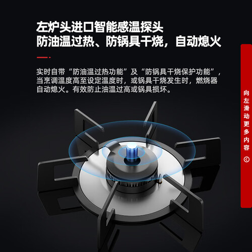 贴心的防干烧燃气灶,避免更多安全隐患,守护家人不放松。60°的科学拢烟区域,一键开合充分带走油烟,厨房清新美观。