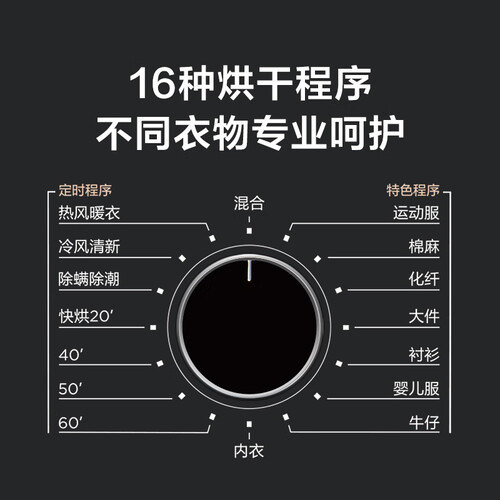 16大烘干程序,呵护不同面料,便捷生活使用。循环冷风技术,轻松带走异味,衣物更清新。LED屏显,信息一目了然,方便操作。