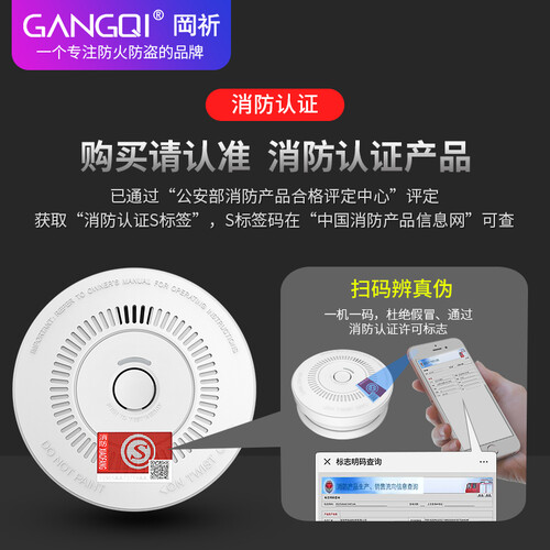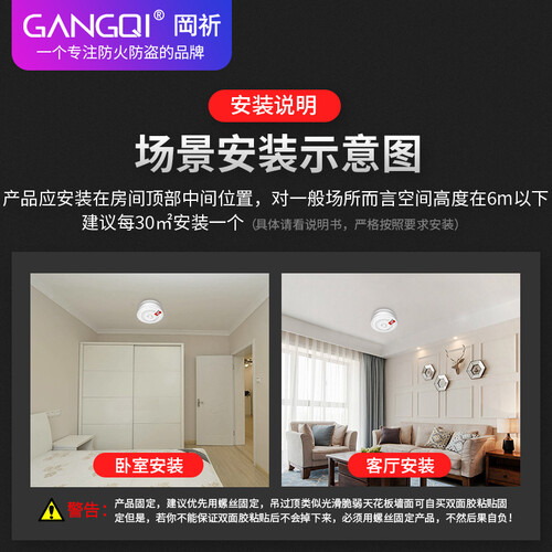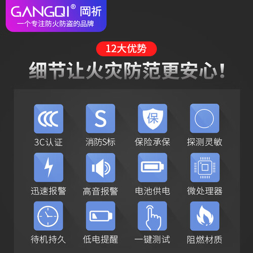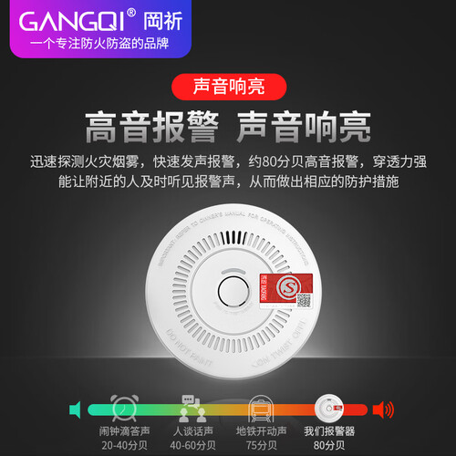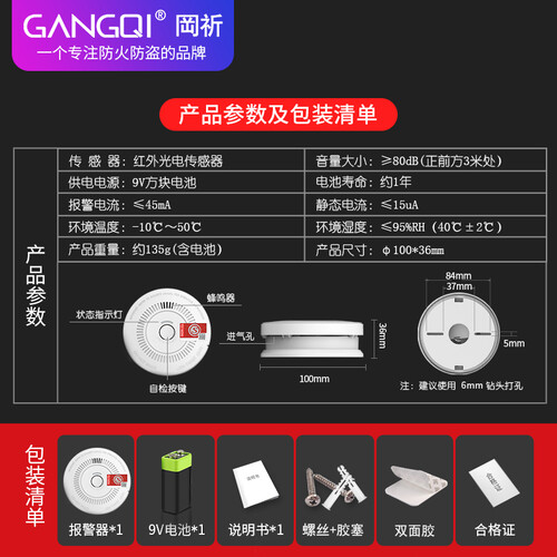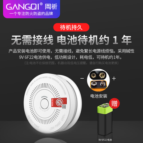 内置蜂鸣器,支持80分贝高音报警,及时提醒你发生的警情。配有9V电池,再加上低功耗设计,耗电量低,待机时尚长。