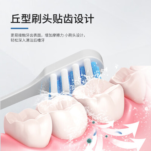 搭载丘型刷头,有效清洁牙齿,更能贴合按摩牙龈。高密度植毛工艺打造,更加柔韧耐用,进一步提升清洁力度。