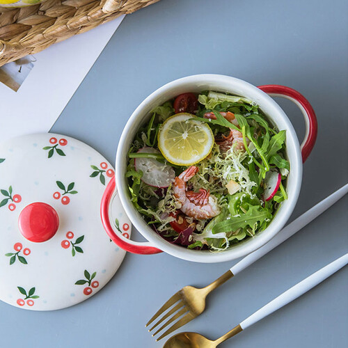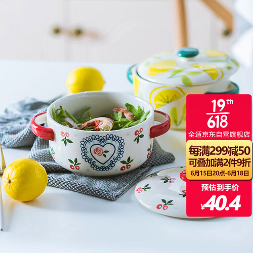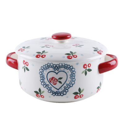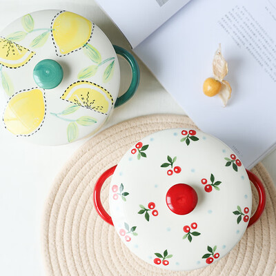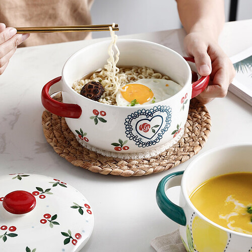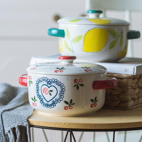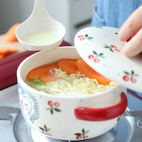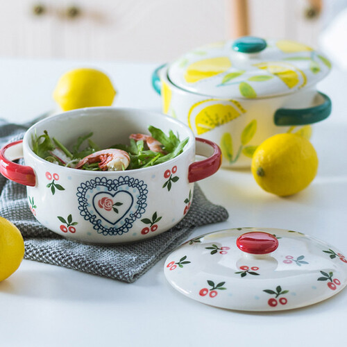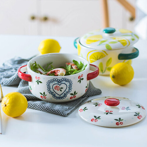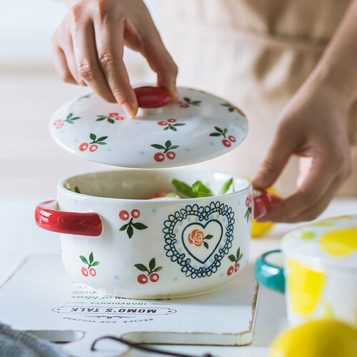 此款使用了手绘釉下彩工艺,釉面光滑细腻,樱桃图案鲜亮;采用双碗耳设计,便于端取和盛放热物,增加您使用时的便利度。