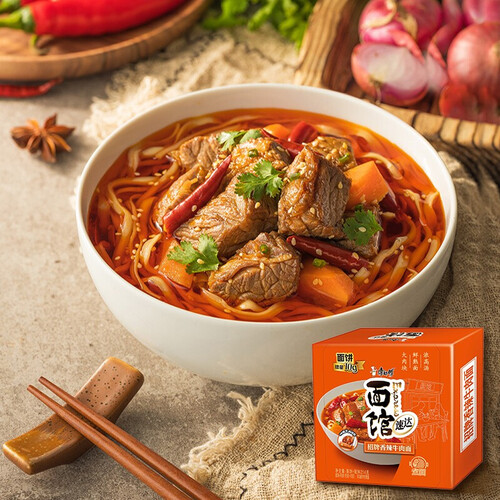 金牌香辣面采用秘制酱料,爆炒葱香搭配豆瓣酱香,闻起来香味绵长,让人食欲大增。八小时熬制的牛骨高汤带来层次丰富的口感。