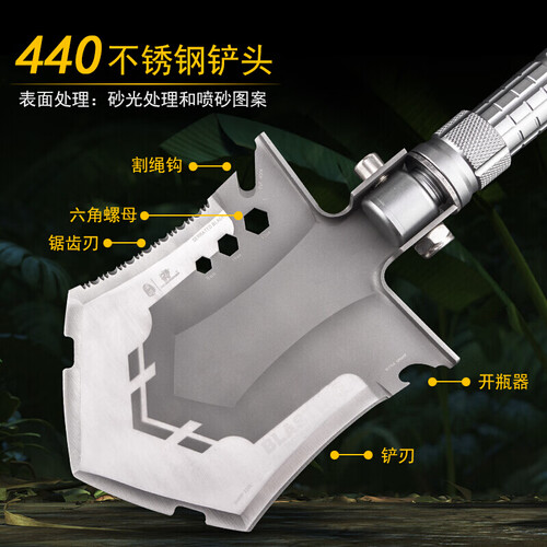 一把铲子具有十六种功能,坚硬的外壳能够满足人们户外探险所需。铲刀具有锋利刀刃,砍树削竹更加快速,铲面坚硬,不易损坏。