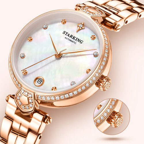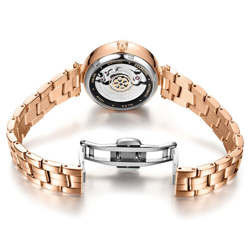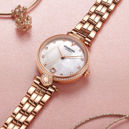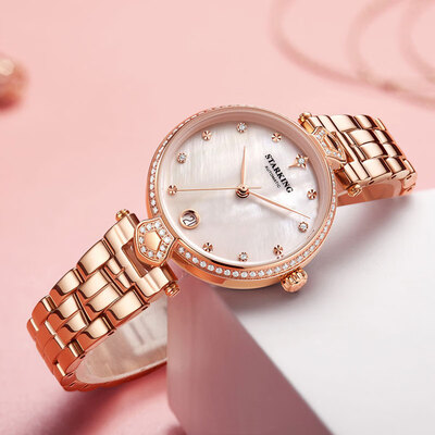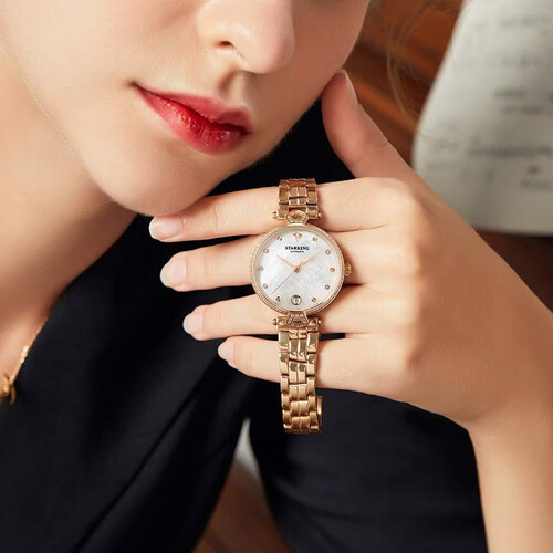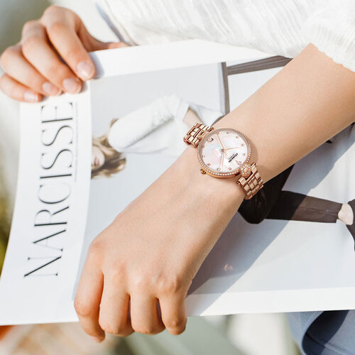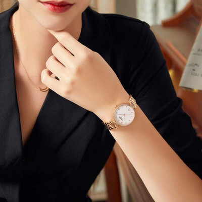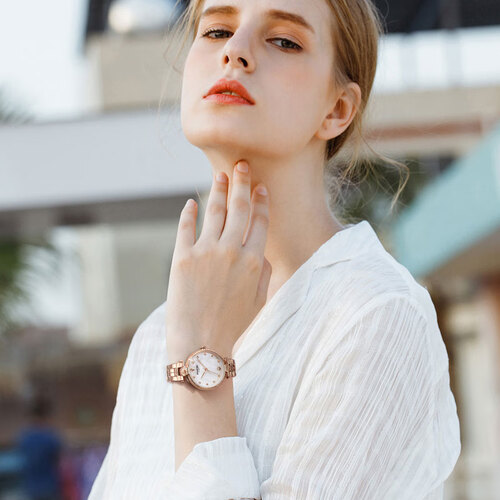 珍珠贝母表盘,唯美渐变色,提高视觉层次。不锈钢材质,耐磨损,久戴如新。特色锆钻点缀,外形璀璨,令手表更具质感。