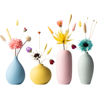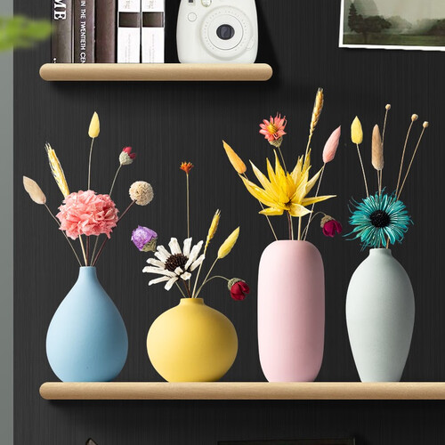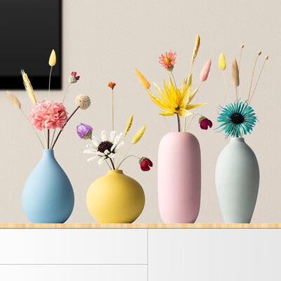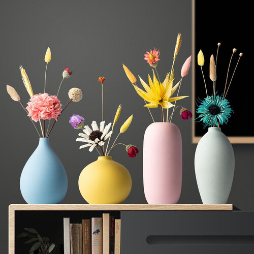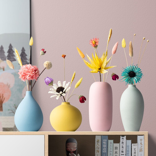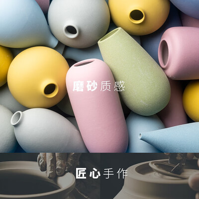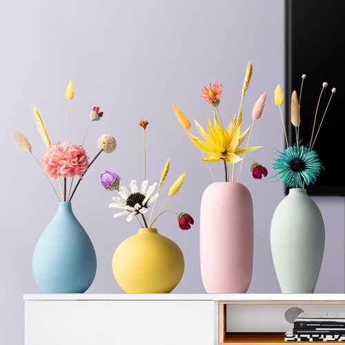 这是一组居家装饰摆件,花瓶采用陶瓷材质打造,磨砂表面更有质感;整体为清新马卡龙色调,搭配天然干花干草,种草颜值少女。