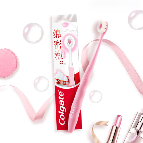 采用圆形小刷头结构,可以深入牙齿内部多角度进行有效清洁。刷毛采用有间距隔断的花瓣式排列设计,促进发泡。