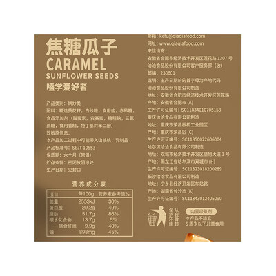 通过分级、比重等五道品质甄选,去除短小籽,饱满均匀少坏籽。外裹甜蜜糖衣,使用特殊复烤工艺,焦香升级,甜而不腻,恰到好处。