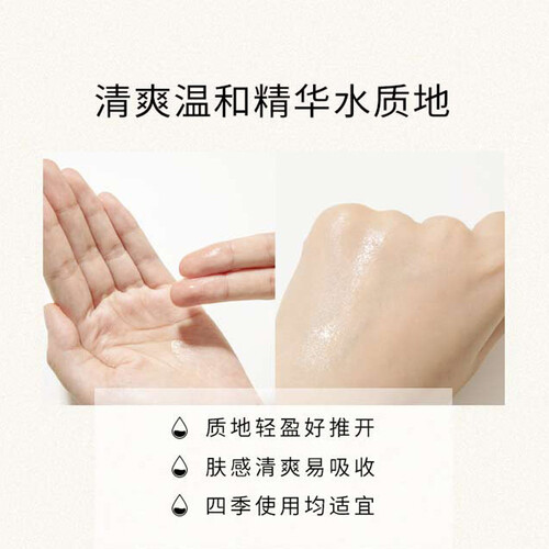 轻盈的质地,易于吸收,保持清爽,四季皆可使用。添加糙米发醇精粹,蕴含充足的养分,调节水油平衡,维持稳定,让肌肤焕现迷人光泽。