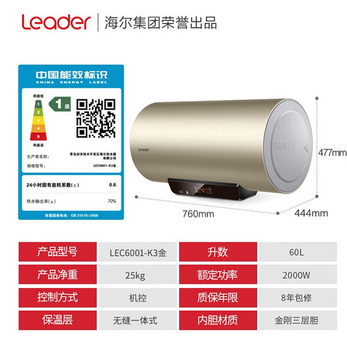 拥有60升大容量设计,可以储存很多热水,全家人一起用更省心;而且还有专利防电墙设计,不会产生漏电的情况。