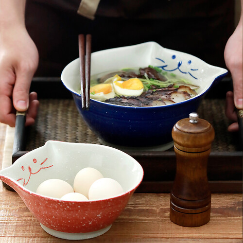 不规则的异型小猫面碗,萌趣可爱,手绘图案别致萌动,雪花釉面别有一番韵味。底部加高设计,方便端拿,防滑防烫。