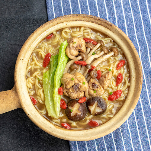 选用散养老母鸡肉,肉质鲜嫩营养滋补,成就一碗爽滑好味道。特别选择非油炸高温蒸工艺,成就健康低脂面饼,拒绝油腻。