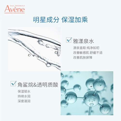 添加角鲨烷天然保湿因子的成分,可为肌肤提供水分,使肌肤水润光滑。复配雅漾泉水精华,可改善敏感肌,强韧屏障。