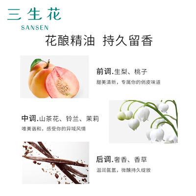 天然精油养护,从发根滋养到发梢。香水级香氛,前调是生梨、桃子,中调是山茶花、铃兰,后调是麝香、香草,让秀发持久留香。