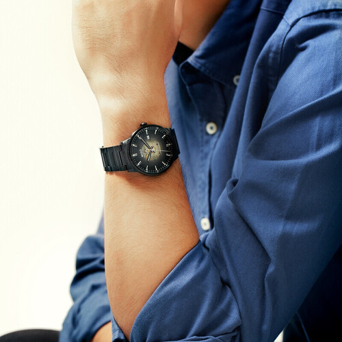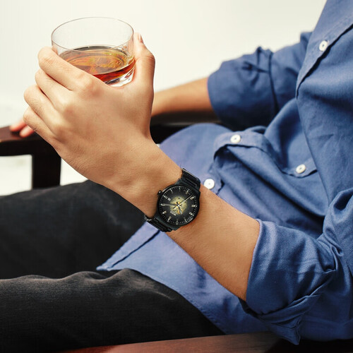 美度机械表拥有独特的烟熏渐变半色半透明表盘,在表盘3点钟位置设有一个白底黑字日期显示窗口,在下方机芯日期轮盘也清晰可见。