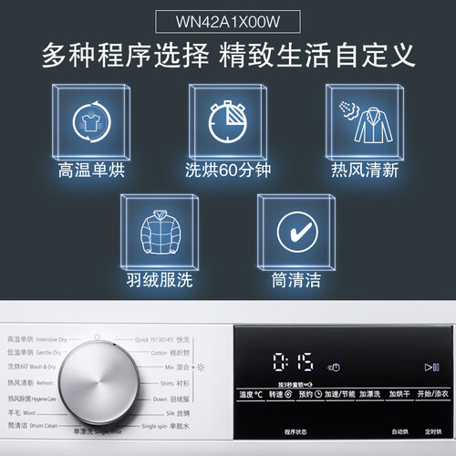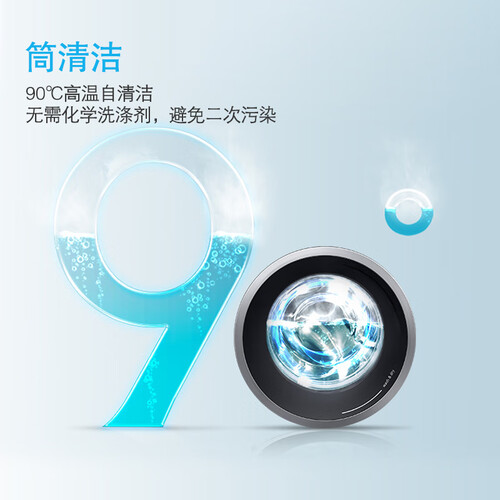 搭载变频洗烘一体程序,精控温度衣干即停,无需晾晒可直接穿着。高温自洁功能,可无死角冲刷内外筒壁,日常洗衣洁净卫生。