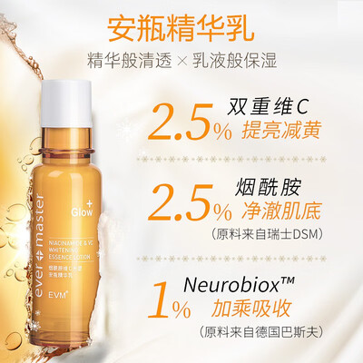 高机能的安瓶乳液,严选VC、烟酰胺等优质精纯原料,模拟人体肌肤的皮脂膜,多维度补水保湿、焕亮肤色,提升肌肤的代谢水平。