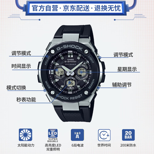双重LED照明功能,夜晚读时依旧清晰,内置石英机芯性能稳定。200米深度防水设计,日常生活使用无忧。