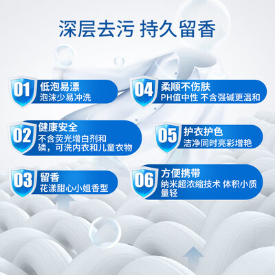 采用德国纳米浓缩技术,让洁净更加深层和强劲,温和不刺激,长久锁香。纳米护色因子强劲锁色,防止衣物串色和染色。