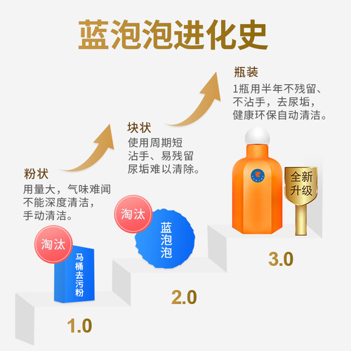 浓缩凝胶配方,采用科学缓释技术,使用时间更长,放入水箱后开始发挥清洁作用,持续使用可保持马桶洁净如新。
