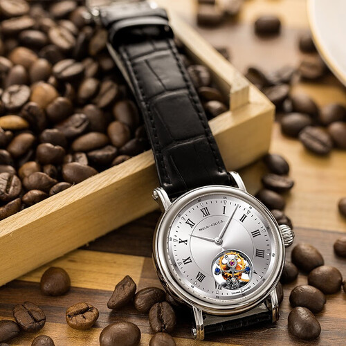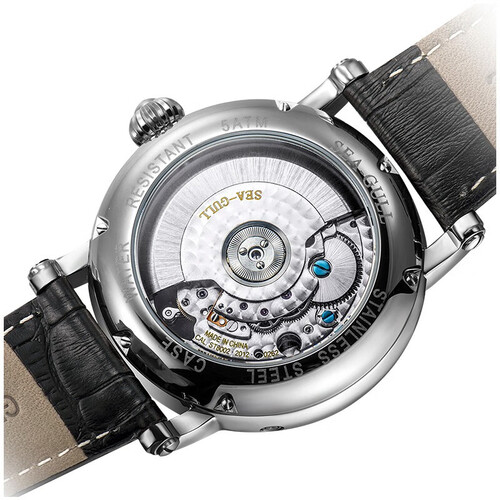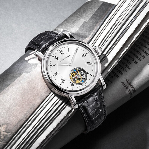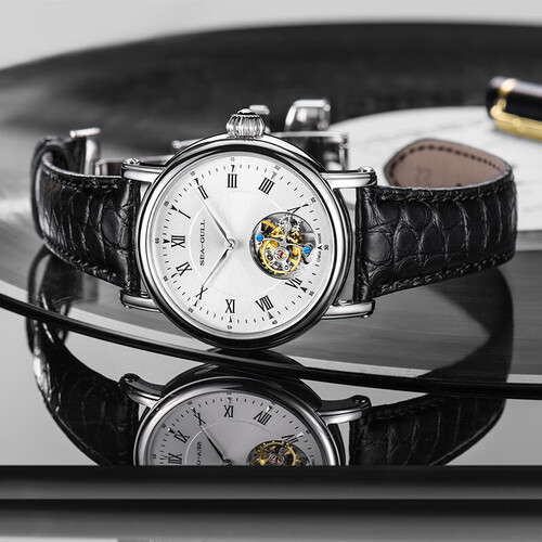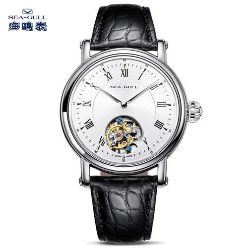 罗马字钉,剑形标准,风格自然大气。鳄鱼皮表带美观大方,不易断裂变形,使用寿命长。素雅的白色盘面附有立体的纹理,美观精致。