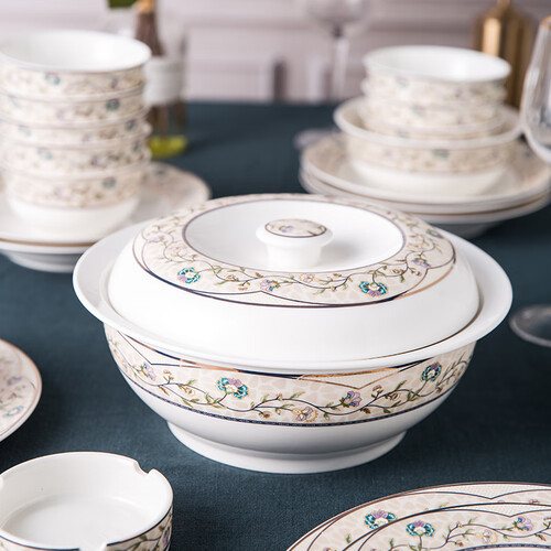 碗边弧度设计,方便端拿不烫手,多种尺寸盘子满足你的盛放需求,精美花纹起到很好的点缀作用,简单不单调。