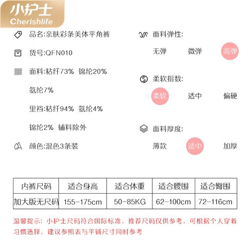 高腰加大的设计,可轻松满足不同身材人群的使用需求,时尚百搭。精选优质的面料,亲肤舒适,不易起球,可延长穿着寿命。