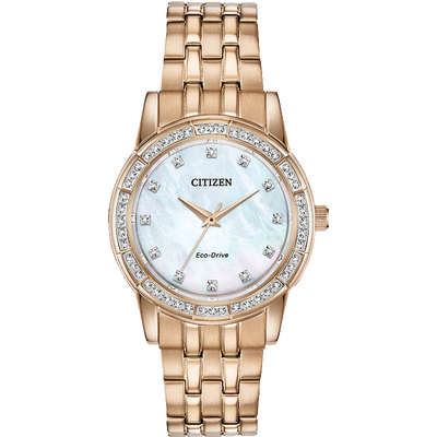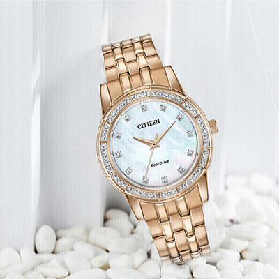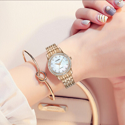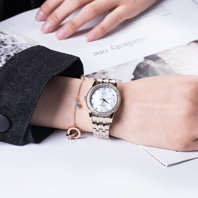 搭载50米生活防水设计,日常洗漱用水不会影响手表使用。贝母表盘,加以闪耀水晶环绕镶嵌,华丽耀眼,佩戴尽显柔美气质。