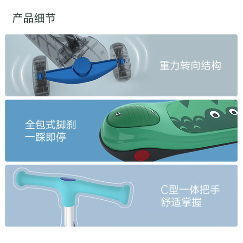 C型曲线设计把手,抓握更舒适,不易产生磕碰。全包式脚刹,避免划伤小脚。轴承采用仿生转向原理,顺畅无阻,转弯更自如。