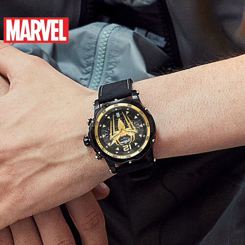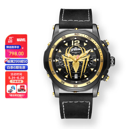 采用黑金的撞色设计搭配蜘蛛造型,款式新颖别致彰显炫酷动漫风。内置夜光指针,方便夜间读取时间,贴心周到。