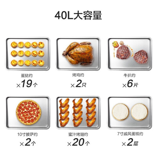 40L的容量设计比较适用于家用,而且不占地方,一台微波炉的地方就能够放蒸烤箱。烤的花样比较多,鸡鸭鱼肉统统可以。