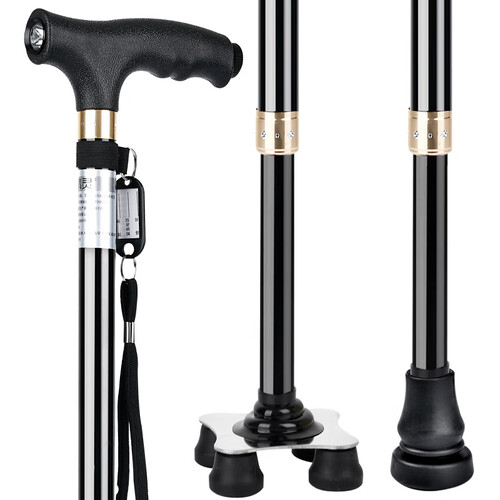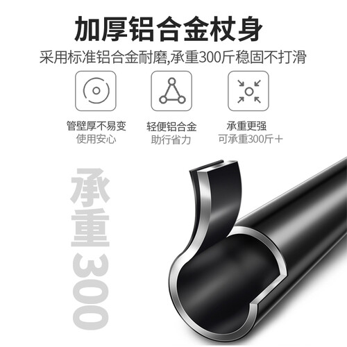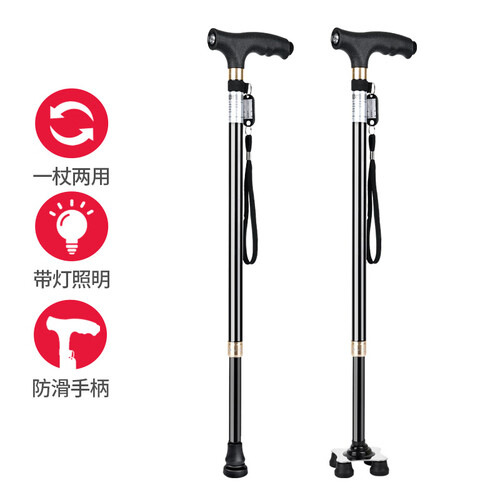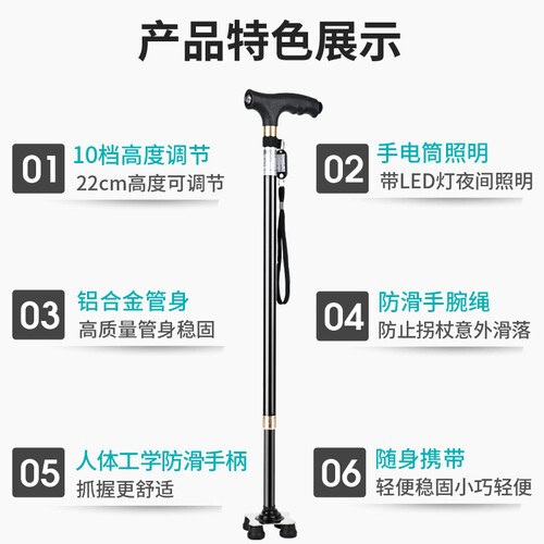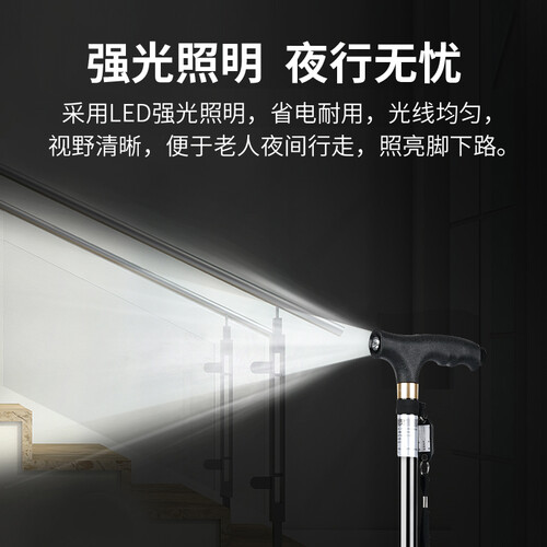 手柄处采用LED强光照明,光线柔和,方便老人夜间行走,增强实用性。防滑手腕绳设计,有效防止拐杖意外滑落。