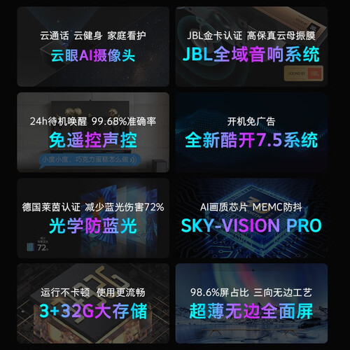 配备高进光云眼AI摄像头,支持视频通话、骨骼识别健身等。搭载JBL全域音响系统,声音层次更分明,带给您天籁般的享受。