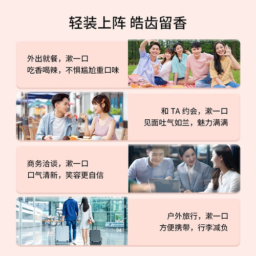 采用精致的匠心配方,温和护理不刺激,呵护你的娇嫩口腔。清新的口味设计,随时随地洁净口腔,保持口气清新。
