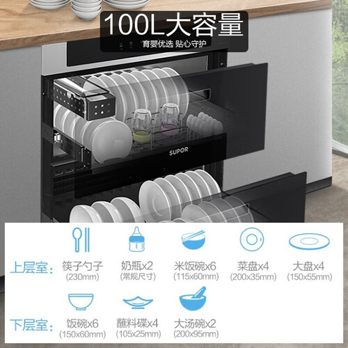 拥有100L的容量,轻松放下一家人的使用餐具,家人用的更放心。中低温烘干储存设计,防止细菌的滋生,母婴使用更安心。