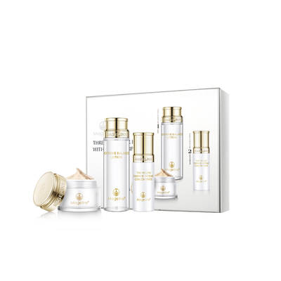 混合型肌肤适用麦吉丽素颜三部曲,平衡水清爽补水、精华素强韧肌底,贵妇美颜膏修饰暗沉,简单三步成就亮透素颜美肌。