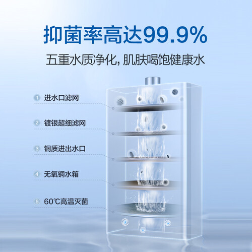 采用全封密式机身设计,轻松避免CO进入,带来更为安全的使用性能。还有五重精细过滤有效抑菌,让洗澡水更健康洁净。